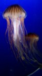 I’m a sucker for the Jellyfish.  I love them; never get bored watching them. If I could, I’d have a big tank in my room, to watch jellies each night as I go to sleep. I find them so soothing, as beautiful as anemones but far more interesting. Their pink bodies against the deep blue of the tank is so stark and stunning. The way their bodies undulate from the bottom to the top of the tank is mesmerizing, their tentacles dragging behind or swaying with the currents. Once I’m there, I often stand watching them until someone in my family insists I move on.  Mackerel or Sardines are my next favorite. To see them swim in huge schools, circling their tanks in unison and switching directions on a dime, is nothing short of stunning. Their instinct to follow one another is compelling to watch, as they move en masse. I’m not sure what it says about me that I like the group fish and the odd jellies, but if I were spending an entire day at any aquarium, I’d spend most of it in front of those two tanks.