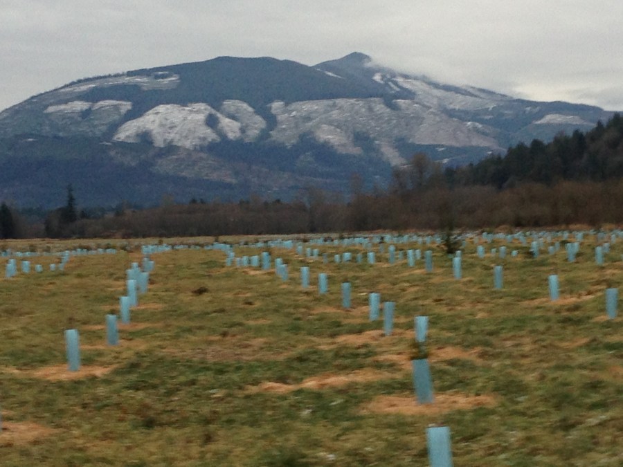 Blue that will one day be forest, and clear-cut highlighted by snow, in the distance.